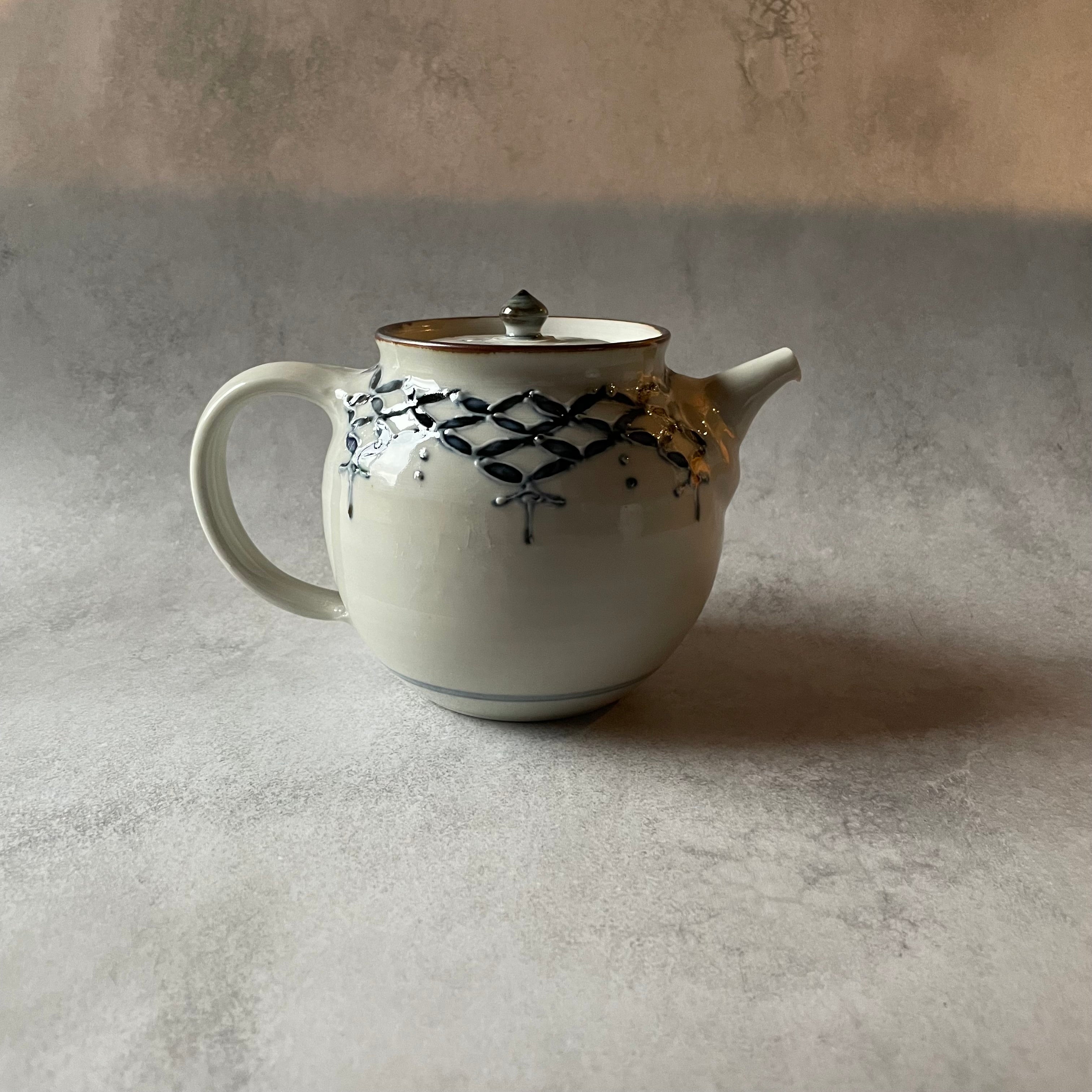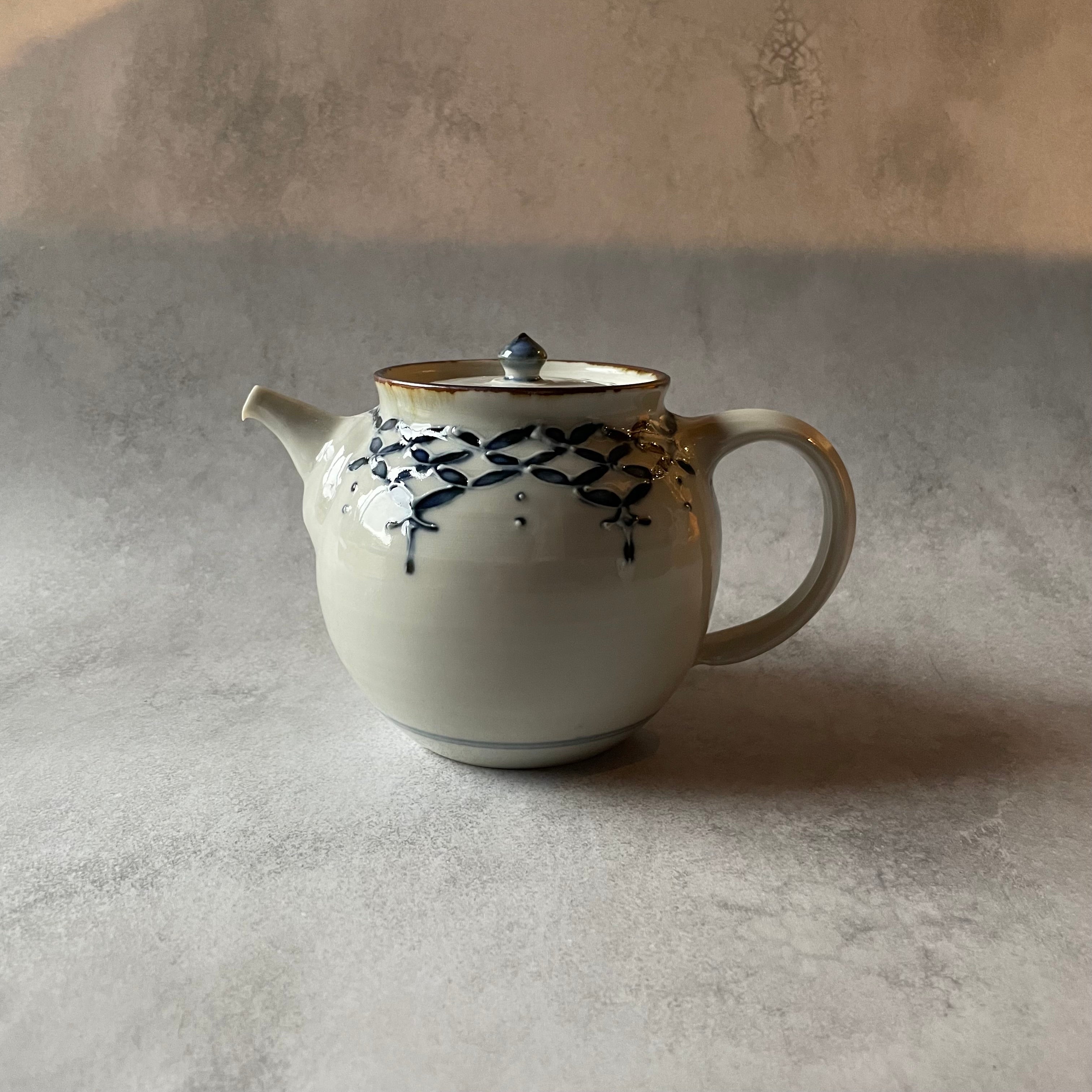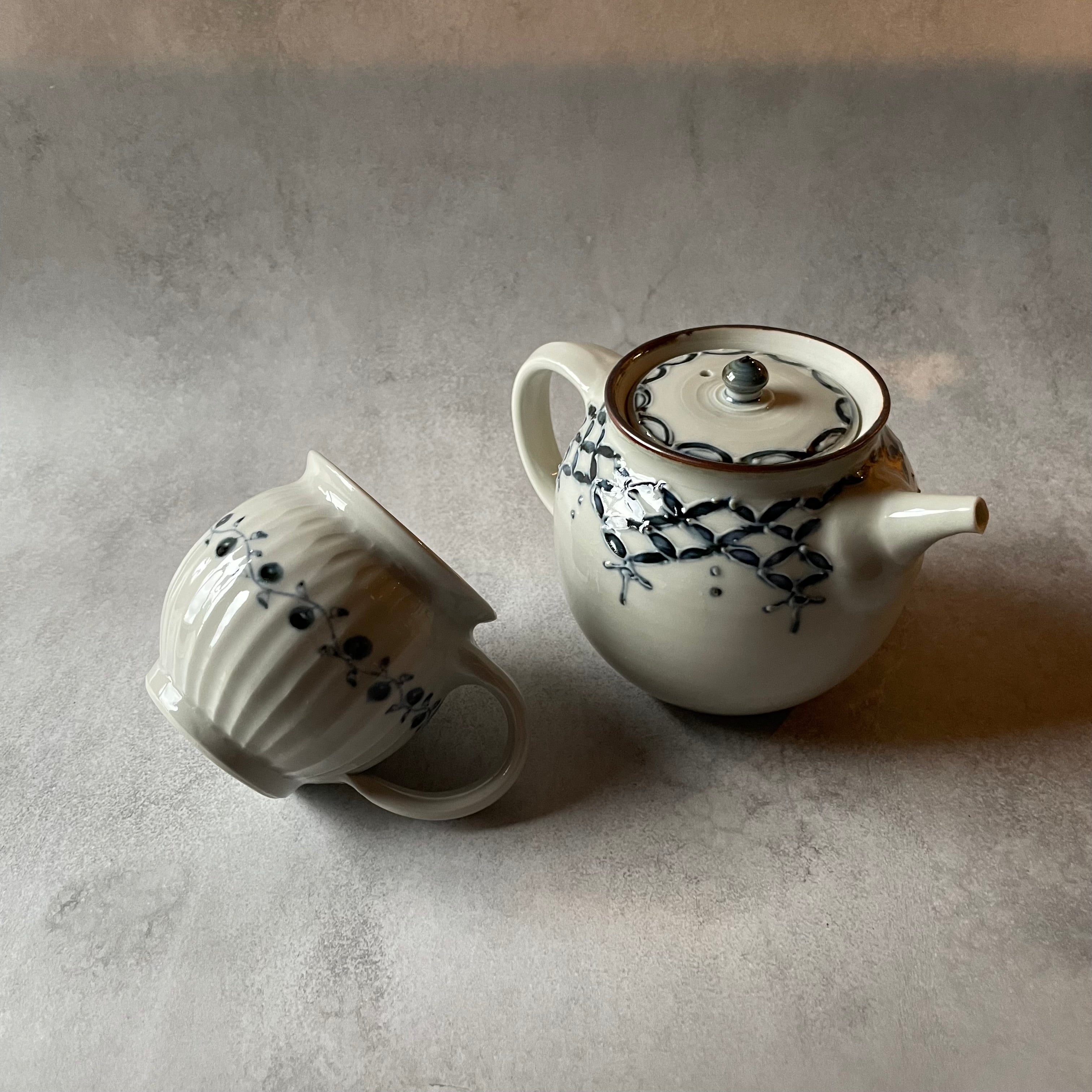 志村和晃さんの染め付けの磁器になります。青色の顔料は呉須(ごす)。淡い青色で染め付けされた絵柄や縁の茶色がレトロな雰囲気を醸し出し、藍色の濃淡を巧みに使い分けた絵付けが施されています。