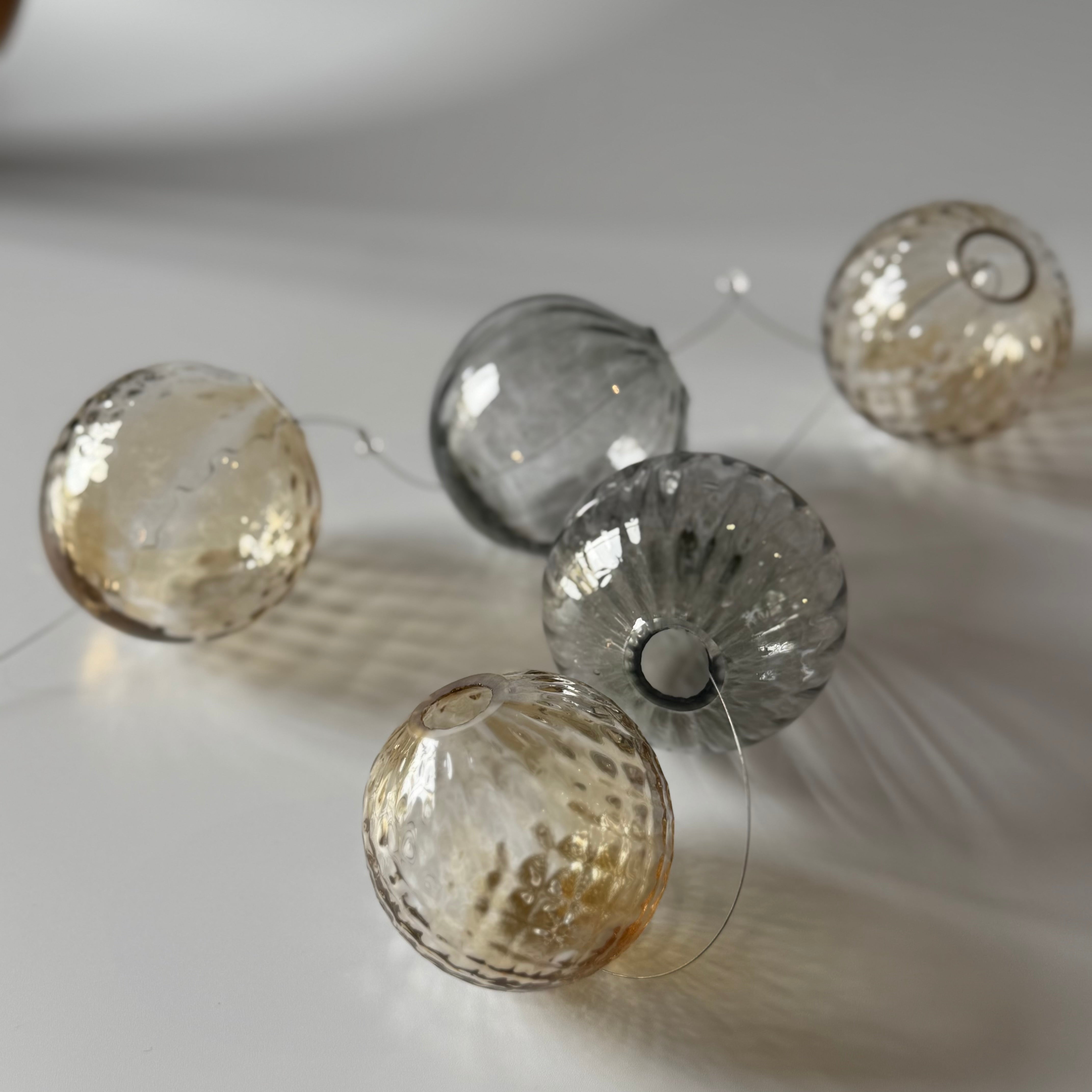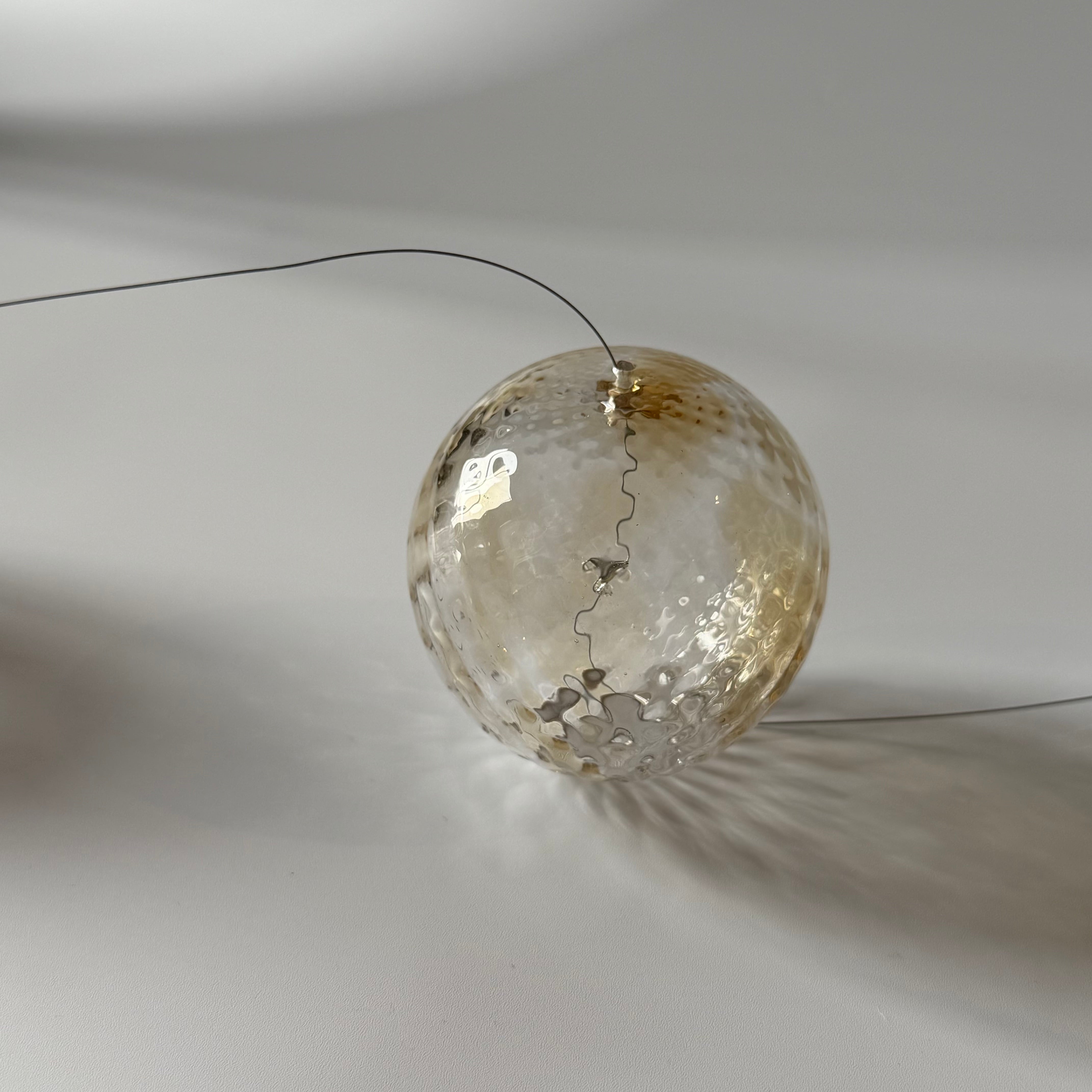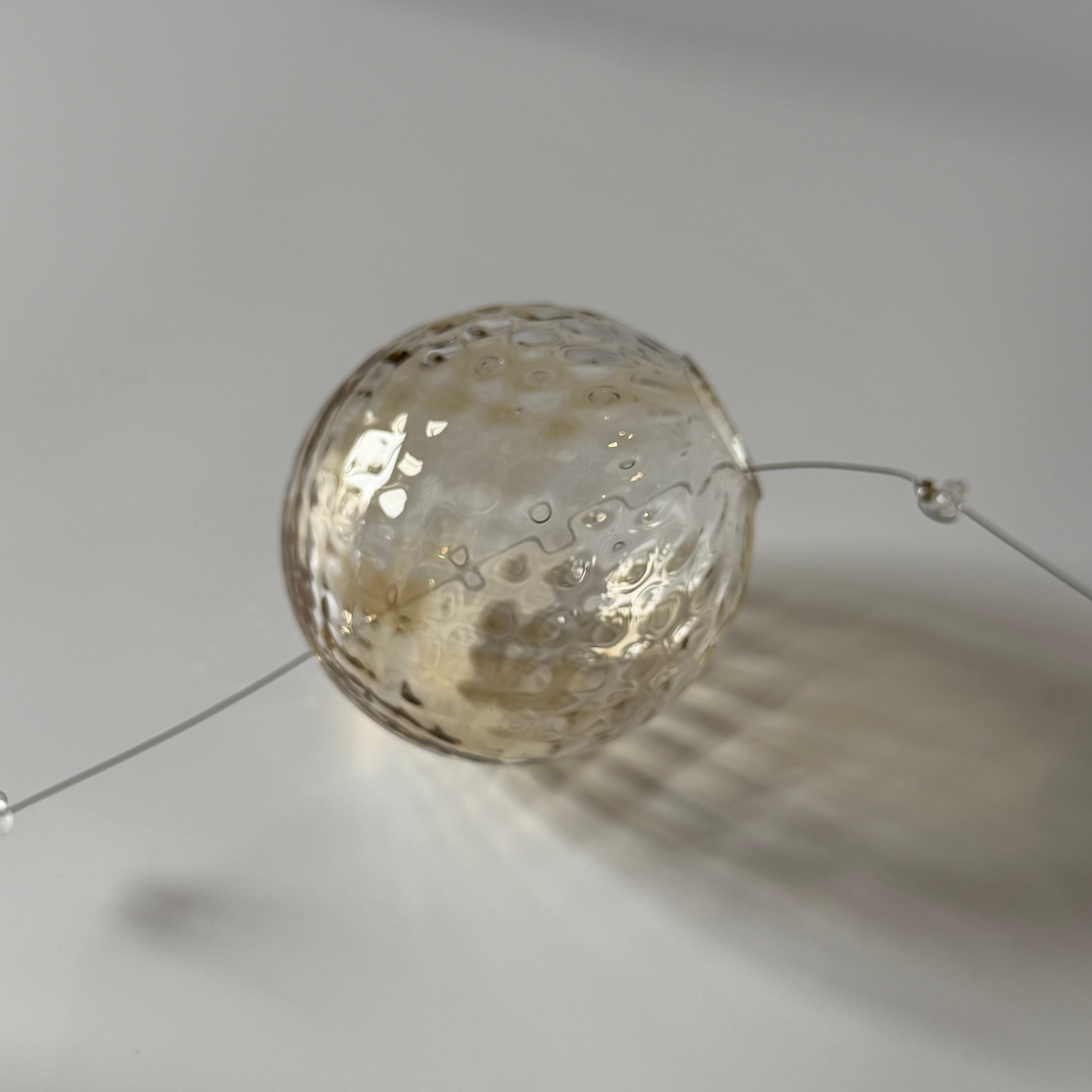 静かに揺れるたび、光を浴びて空間に柔らかな表情を作り出す、吹きガラスならではの揺らぎと透明感が美しいガラスモビールです。