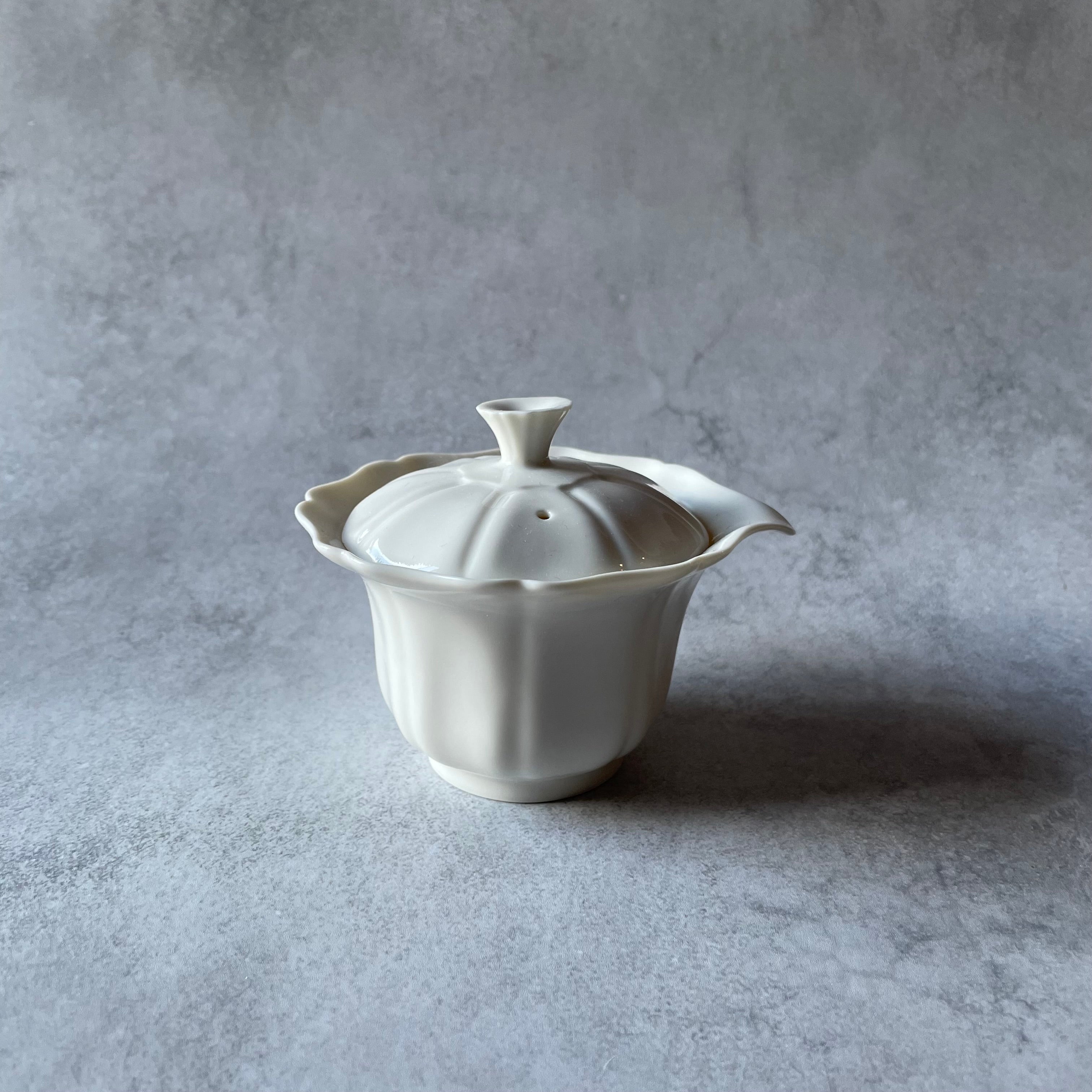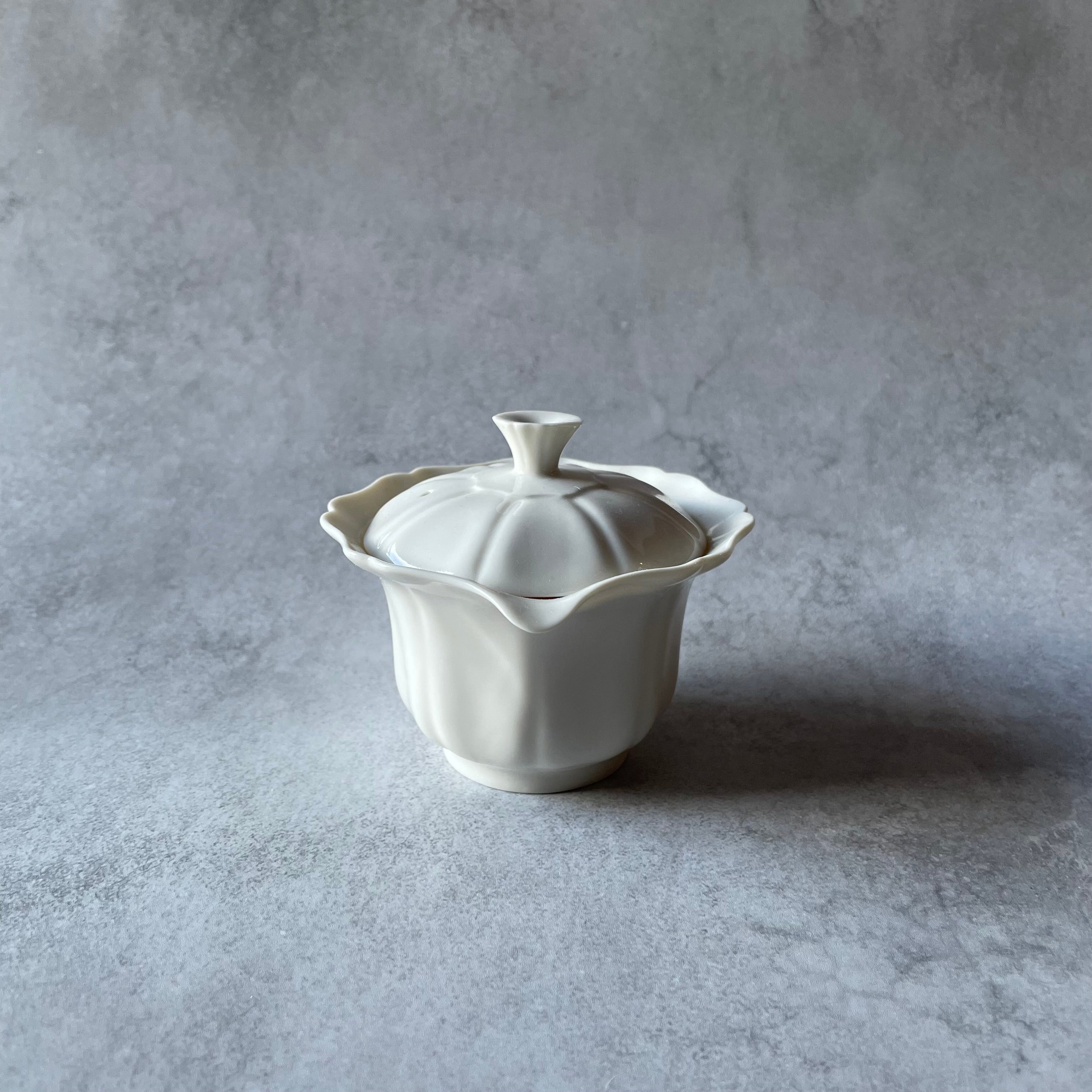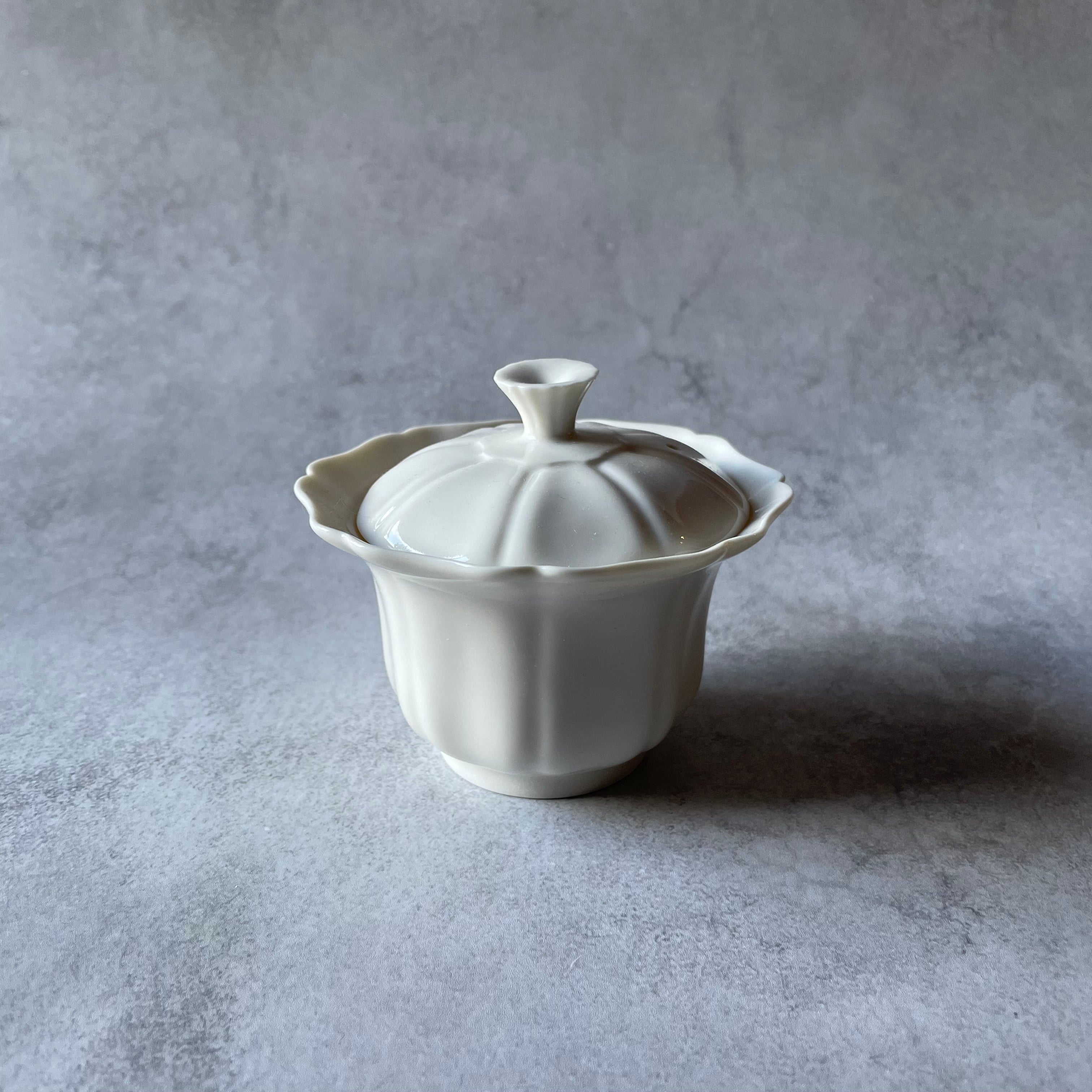 輪花の口縁と、ふっくらとした胴。白磁のやわらかな光沢が、凛とした品格を与えます。装飾を抑えた造形だからこそ、形の美しさが際立つ一客です。