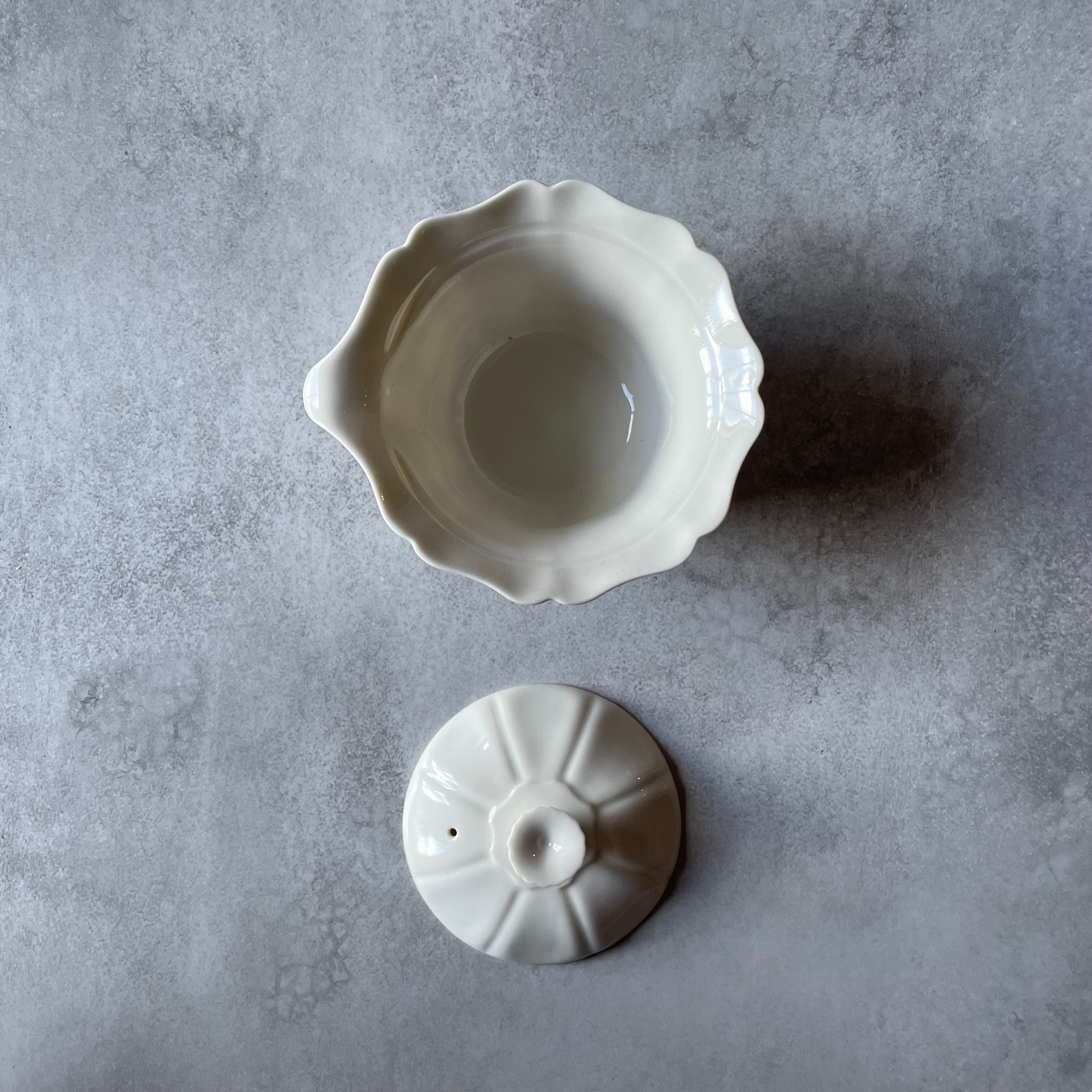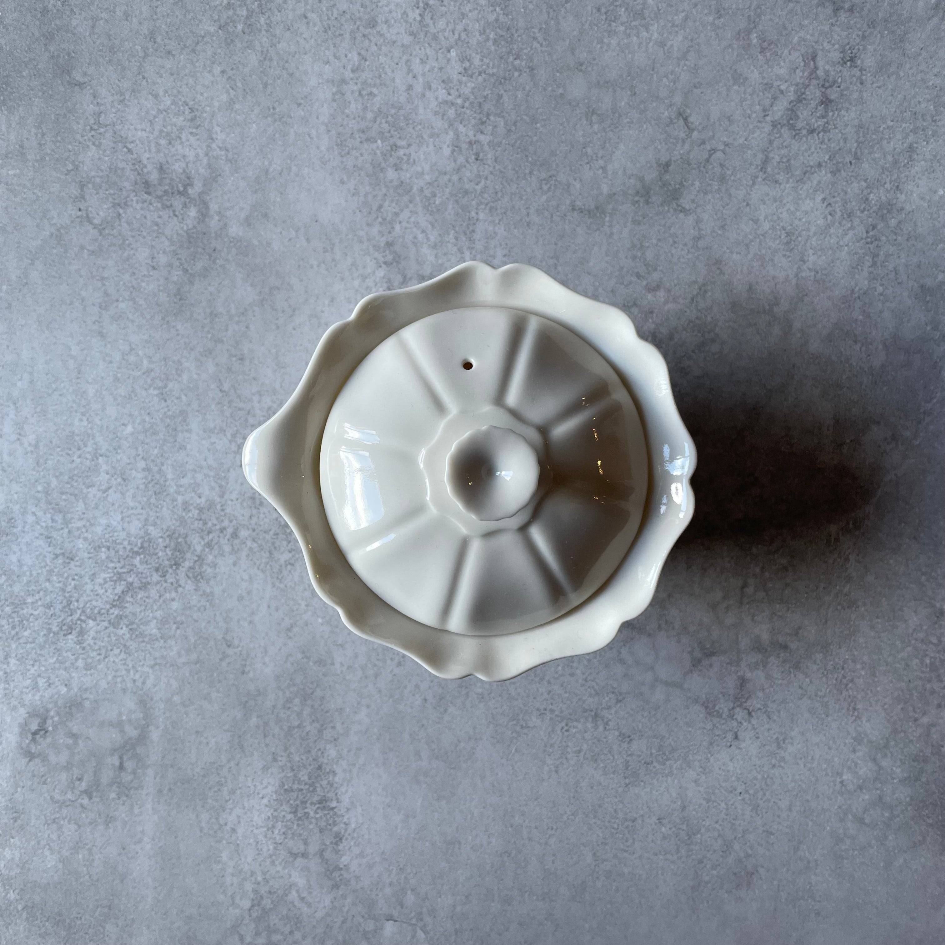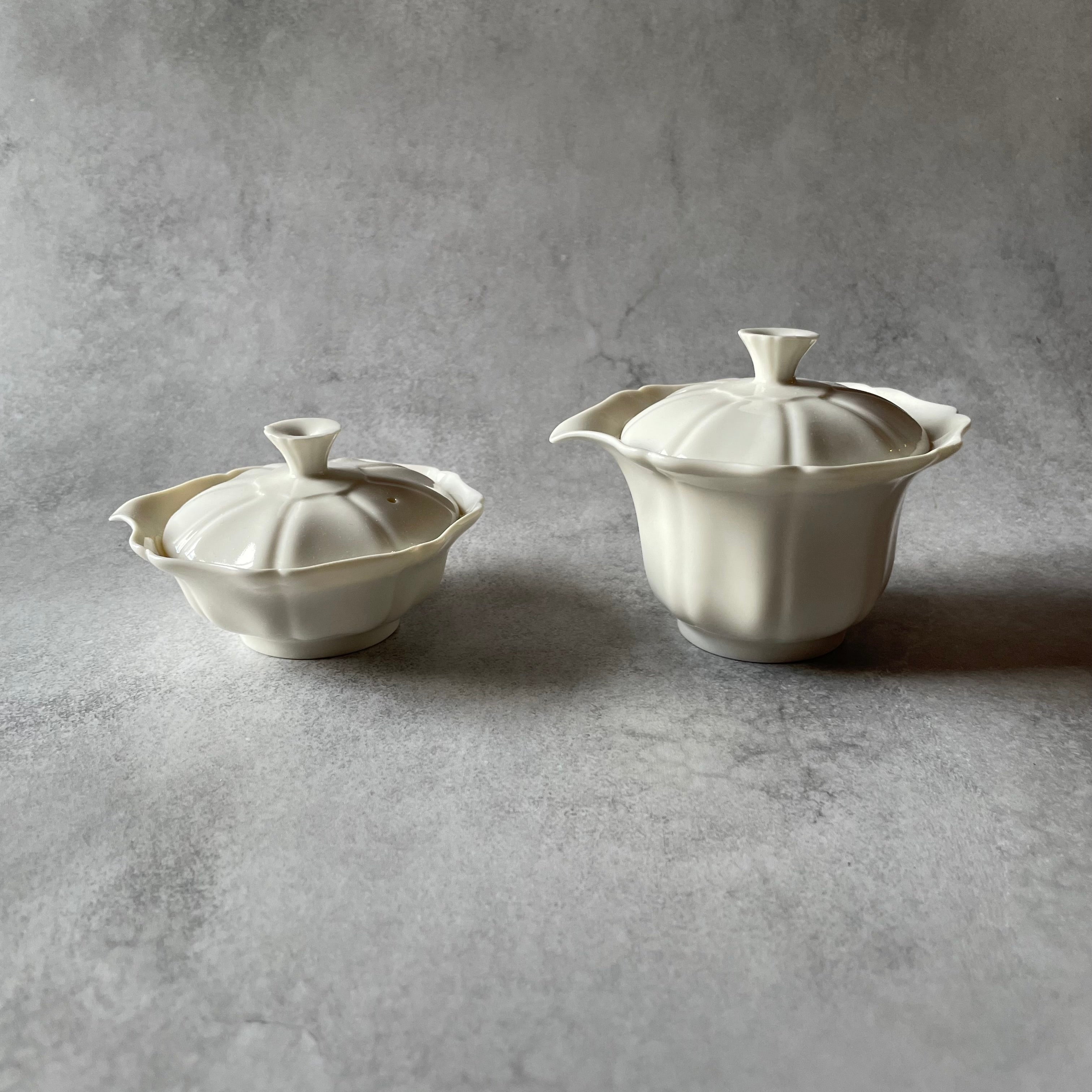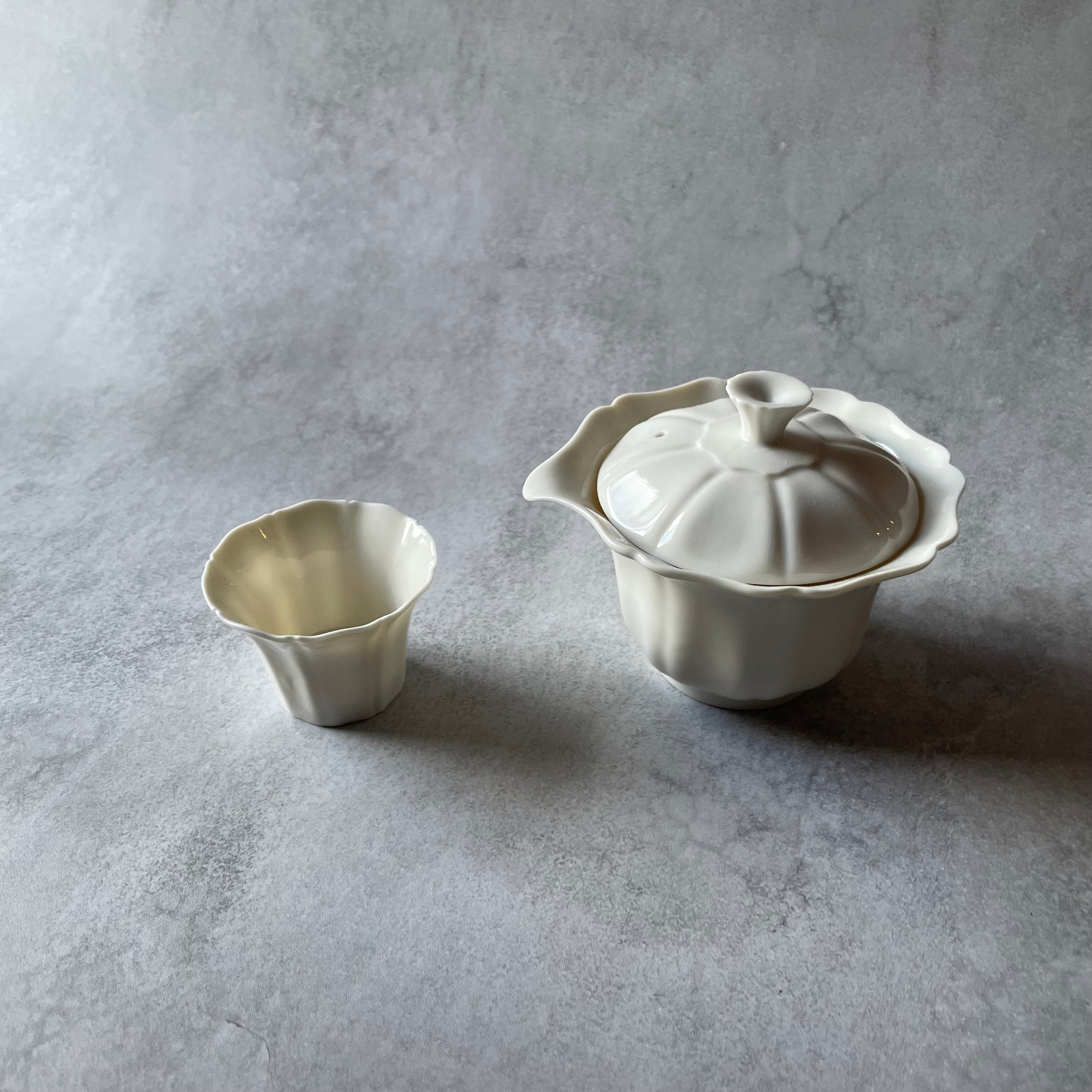 輪花の口縁と、ふっくらとした胴。白磁のやわらかな光沢が、凛とした品格を与えます。装飾を抑えた造形だからこそ、形の美しさが際立つ一客です。
