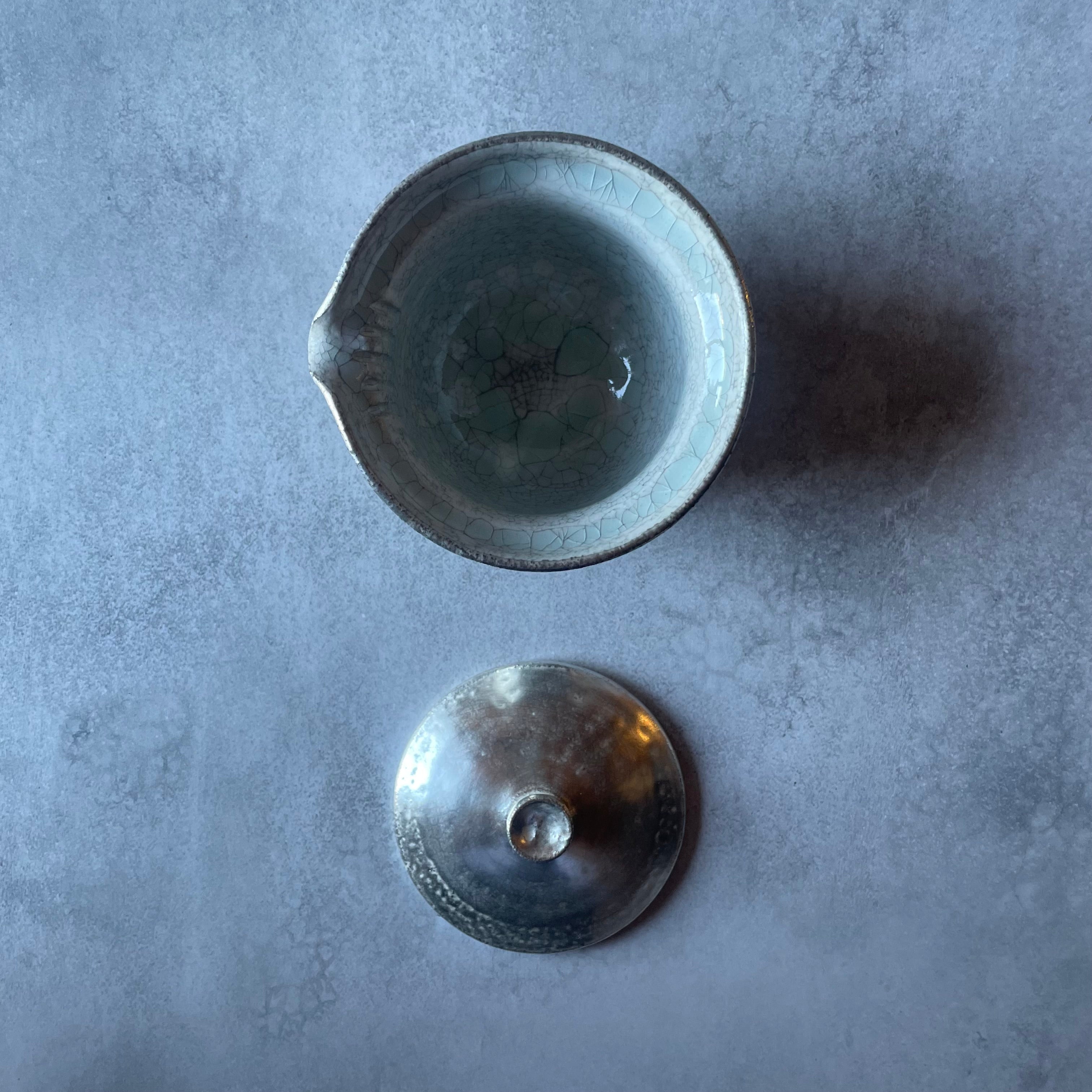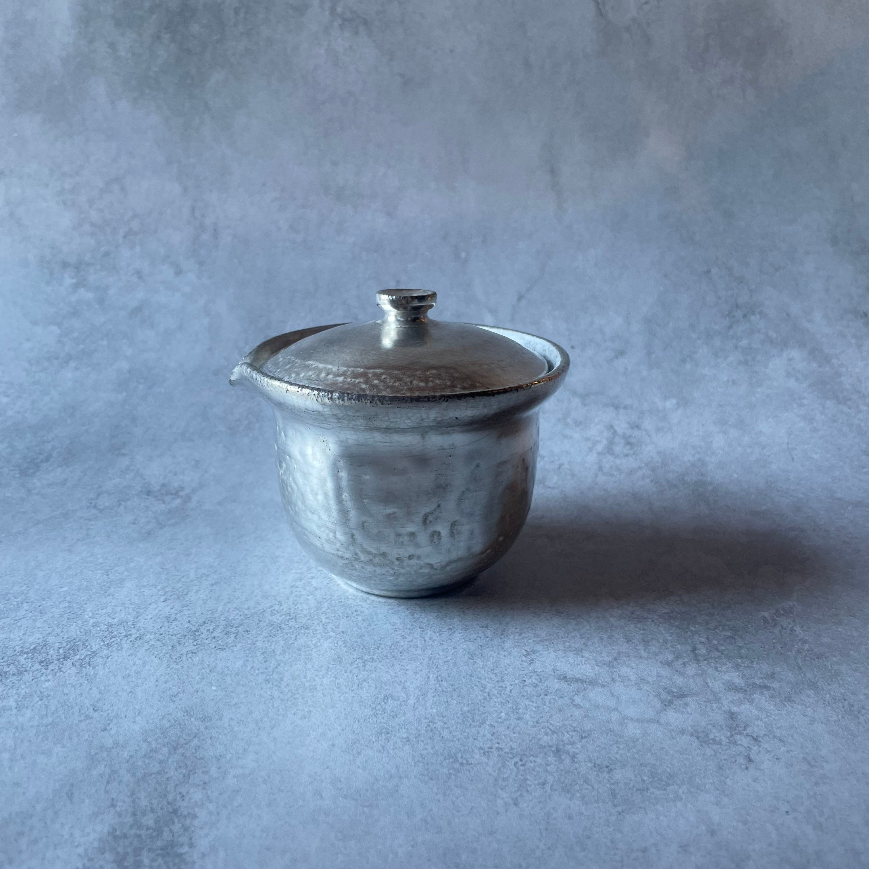静かに輝く銀色の表情と、内側に広がる美しい貫入が特徴の宝瓶です。