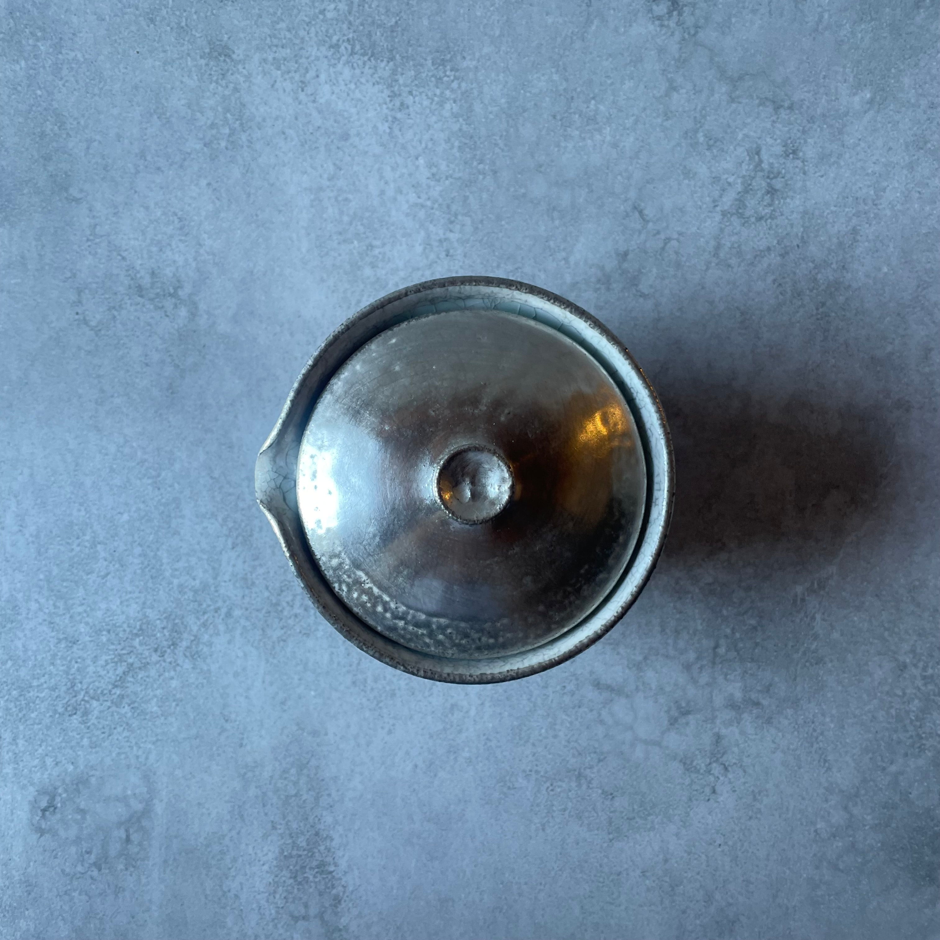 外側は金属のような深みのある質感で、光の角度によってゆらぎが浮かび上がり、まるで古い銀器のような風格を感じさせます。手触りはやわらかく、手仕事ならではの温もりと存在感があります。