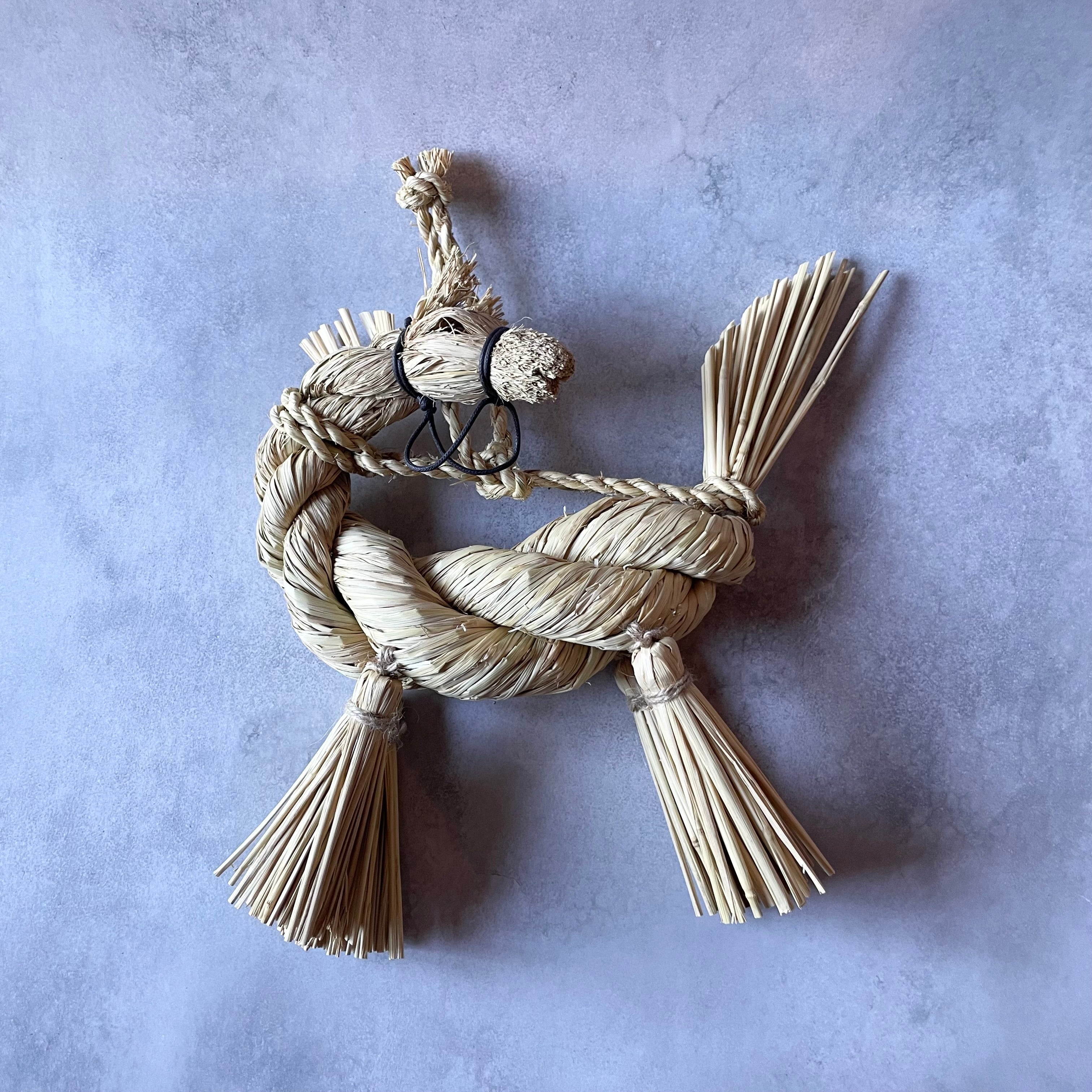 このしめ縄は、その「前進」「開運」「勢い」といった馬の力を、太くしっかりとした藁の編み込みで表現しています。 たてがみや尻尾まで細やかに仕立てられ、素朴ながらも凛とした佇まいをもっています。
