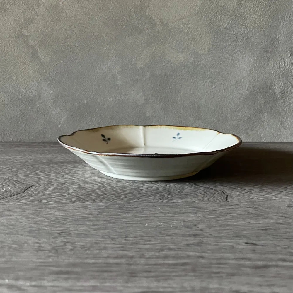 志村和晃さんの染め付けの磁器になります。青色の顔料は呉須(ごす)。淡い青色で染め付けされた絵柄や縁の茶色がレトロな雰囲気を醸し出し、藍色の濃淡を巧みに使い分けた絵付けが施されています。和、洋、幅広く料理を選ばない器です。
