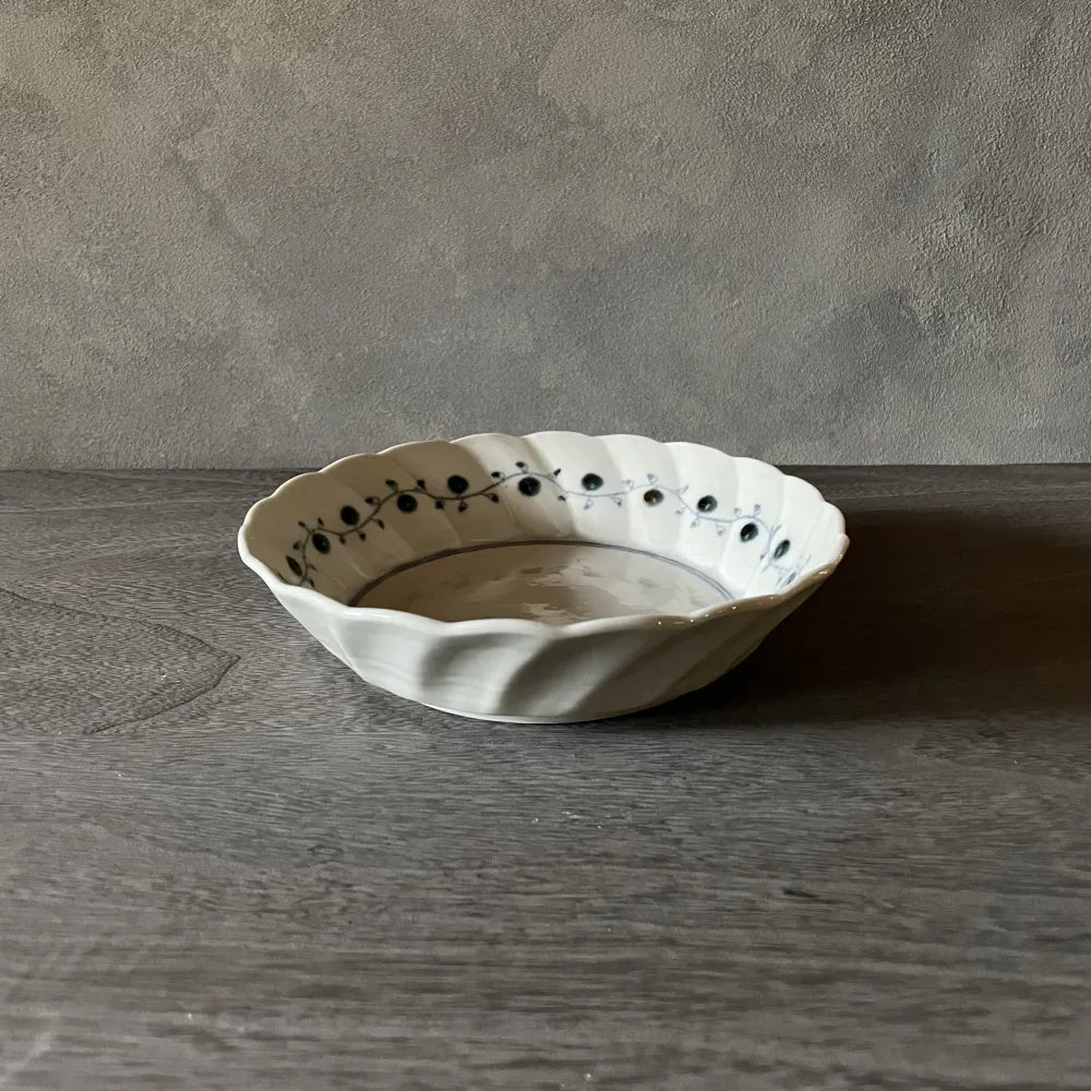 志村和晃さんの染め付けの磁器になります。青色の顔料は呉須(ごす)。淡い青色で染め付けされた絵柄や縁の茶色がレトロな雰囲気を醸し出し、藍色の濃淡を巧みに使い分けた絵付けが施されています。和、洋、幅広く料理を選ばない器です。深さがあるので、汁物の料理にも合います。