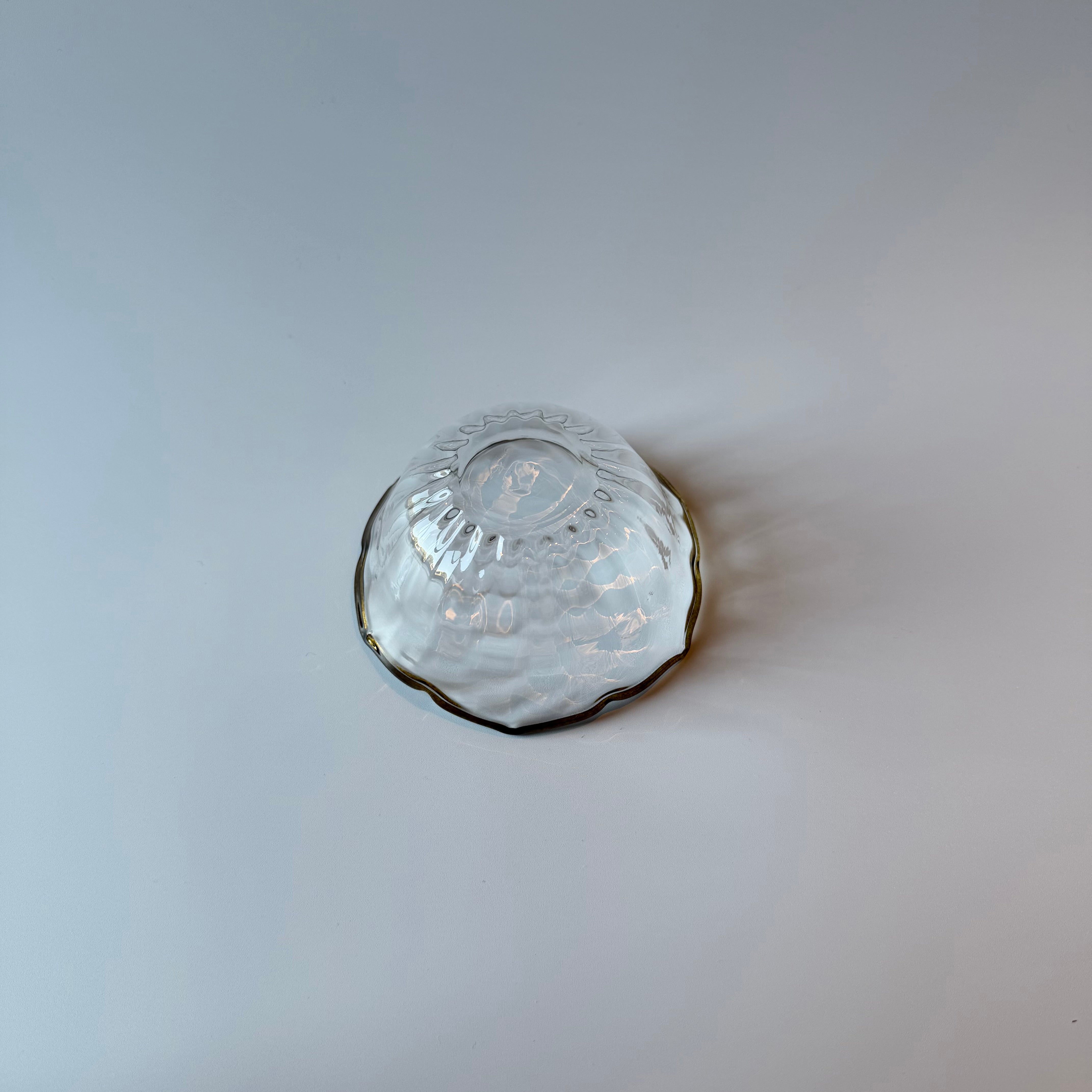 透明なガラスの中に、放射線状に広がる模様。光を受けると、器のまわりにやさしく光が広がり、ガラスならではの涼やかな表情を楽しめます。