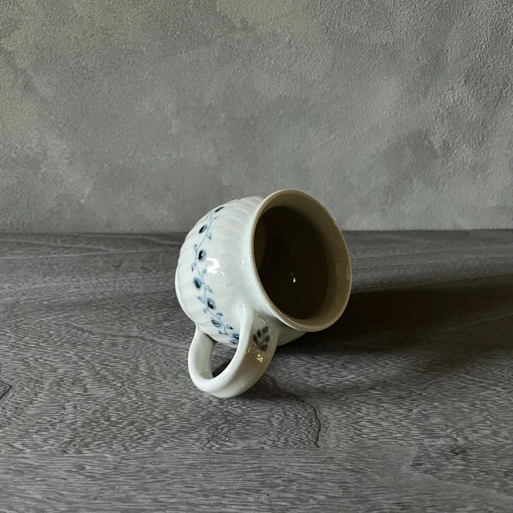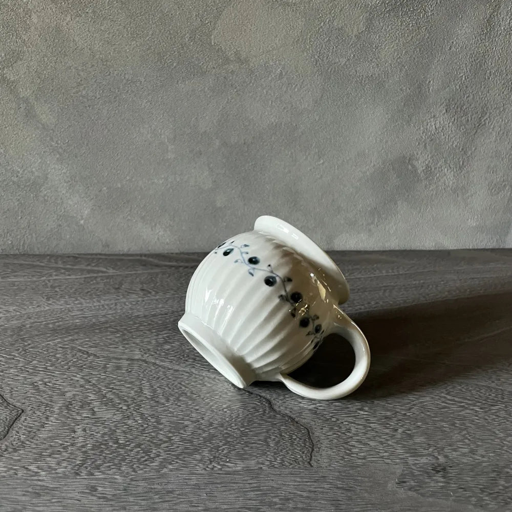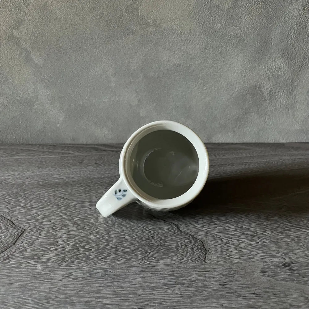 志村和晃さんの染め付けの磁器になります。青色の顔料は呉須(ごす)。淡い青色で染め付けされた絵柄や縁の茶色がレトロな雰囲気を醸し出し、藍色の濃淡を巧みに使い分けた絵付けが施されています。