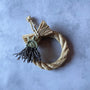 実りの象徴である稲穂をぜいたくにあしらい、手仕事の温かみを残したしめ飾りです。