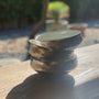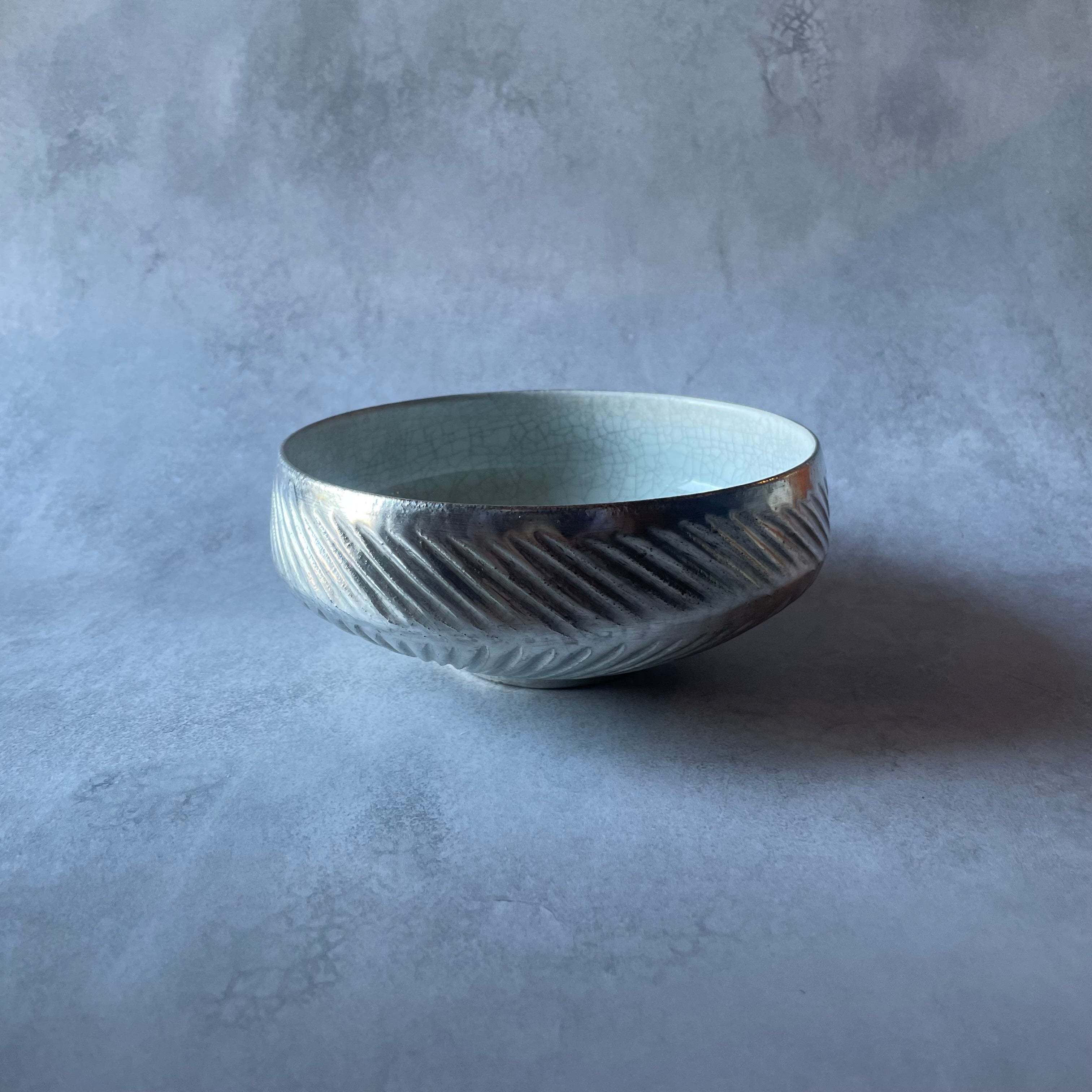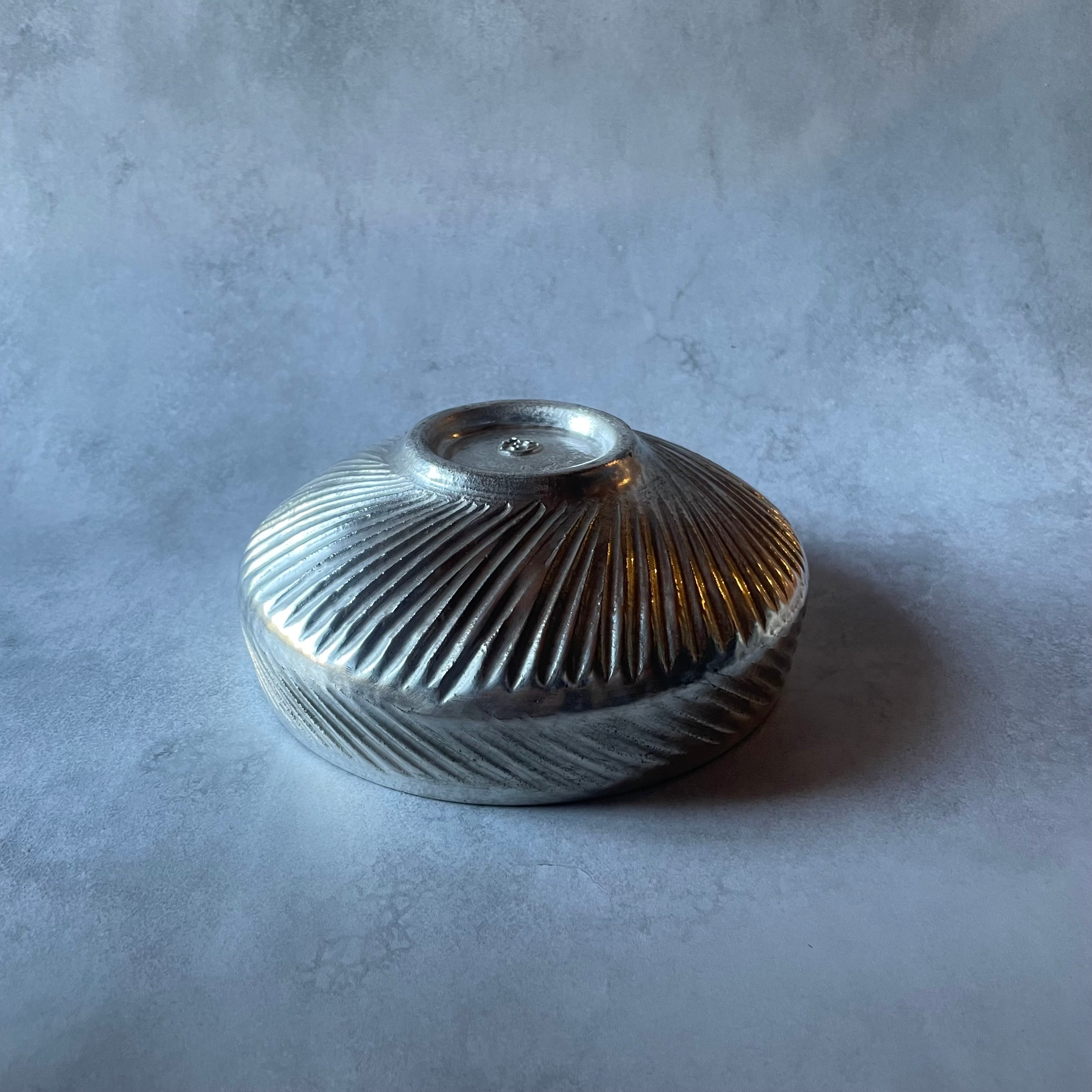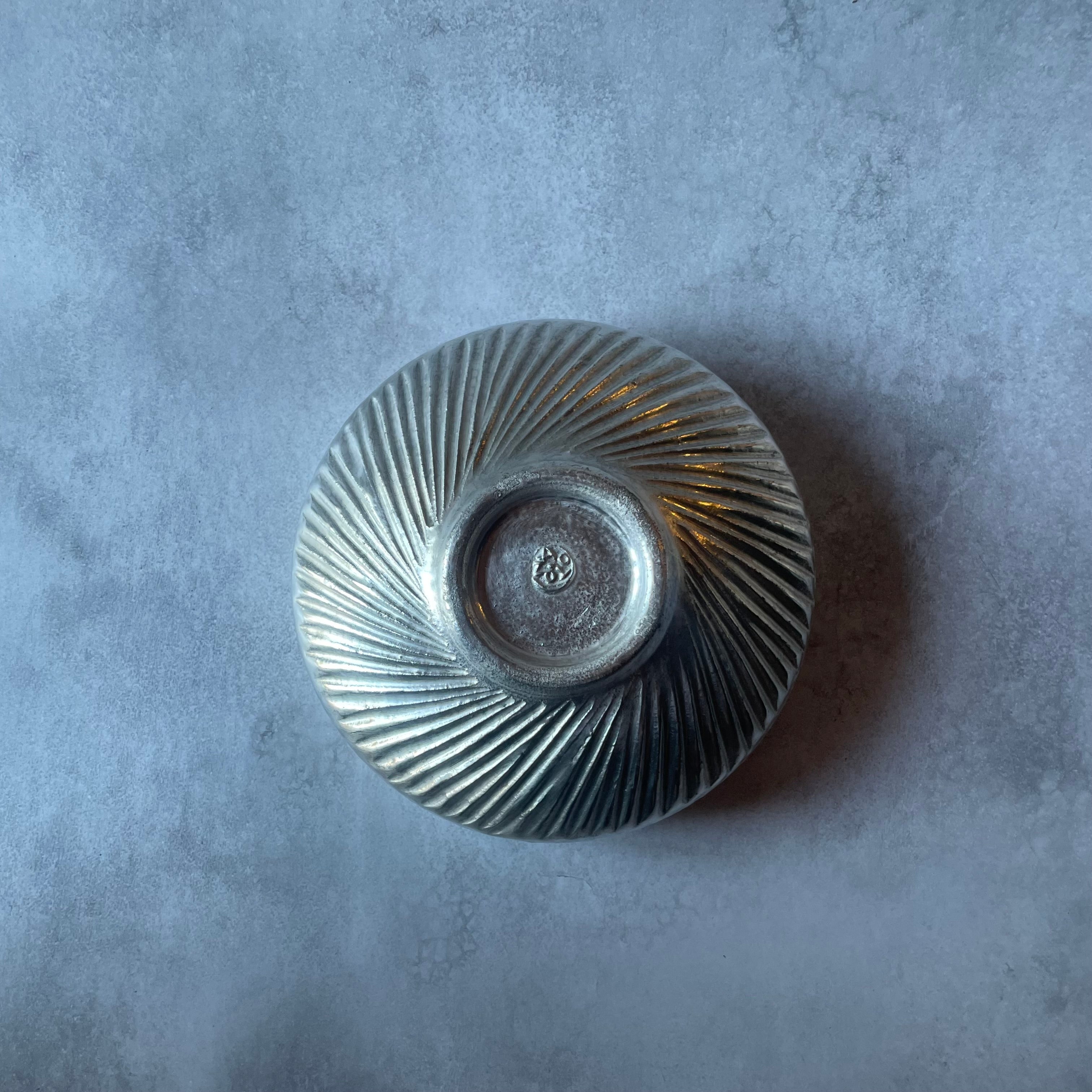 外側は斜めに刻まれたレリーフが光を受けてやわらかく輝き、銀彩のような深い表情を生み出しています。手仕事ならではの立体感と、落ち着きある艶が調和した上質な一品です。